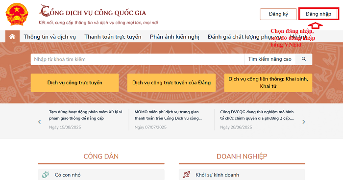 Cá nhân đăng nhập vào dịch vụ công quốc gia bằng VNEid tại địa chỉ: